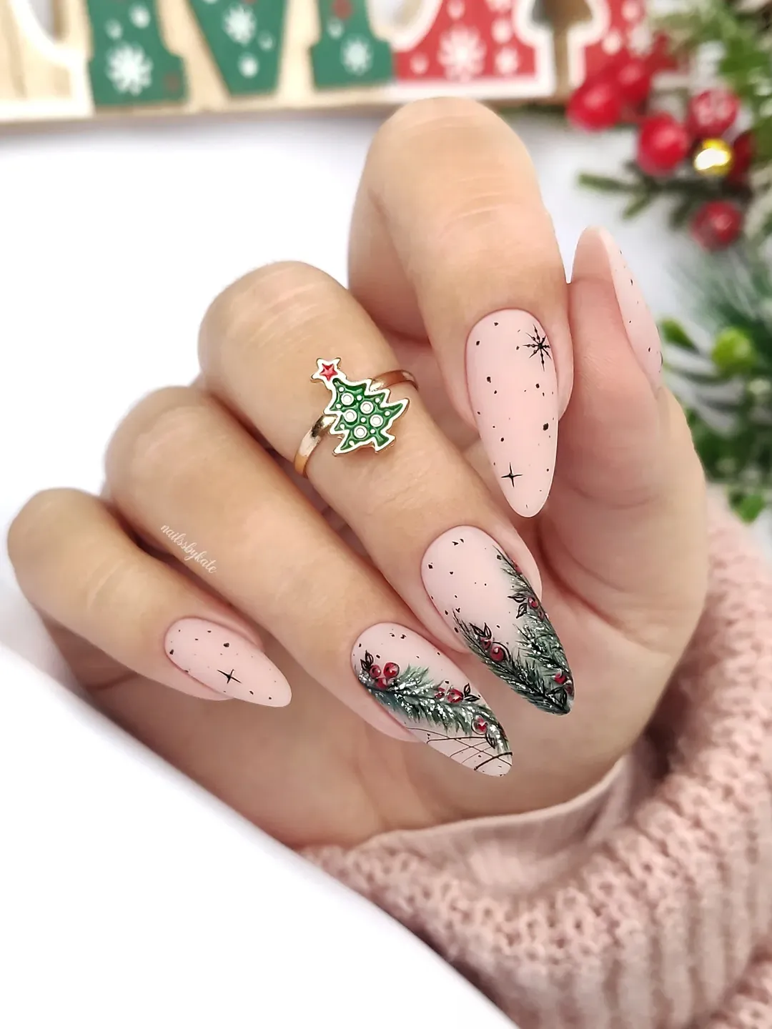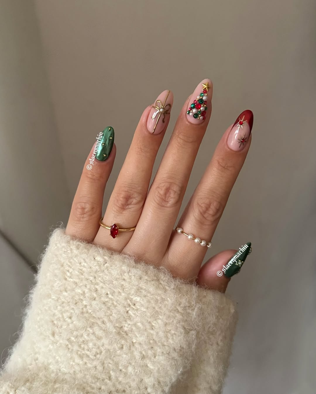Green manicures—especially emerald, olive, and glittery forest shades—capture the Christmas tree aesthetic in the most fashionable way. Trend reports show a rising interest in green because of its depth and vibrancy, especially when combined with chrome finishes. It’s a top pick in “Christmas nail inspo” guides for those wanting a bold yet seasonal manicure.