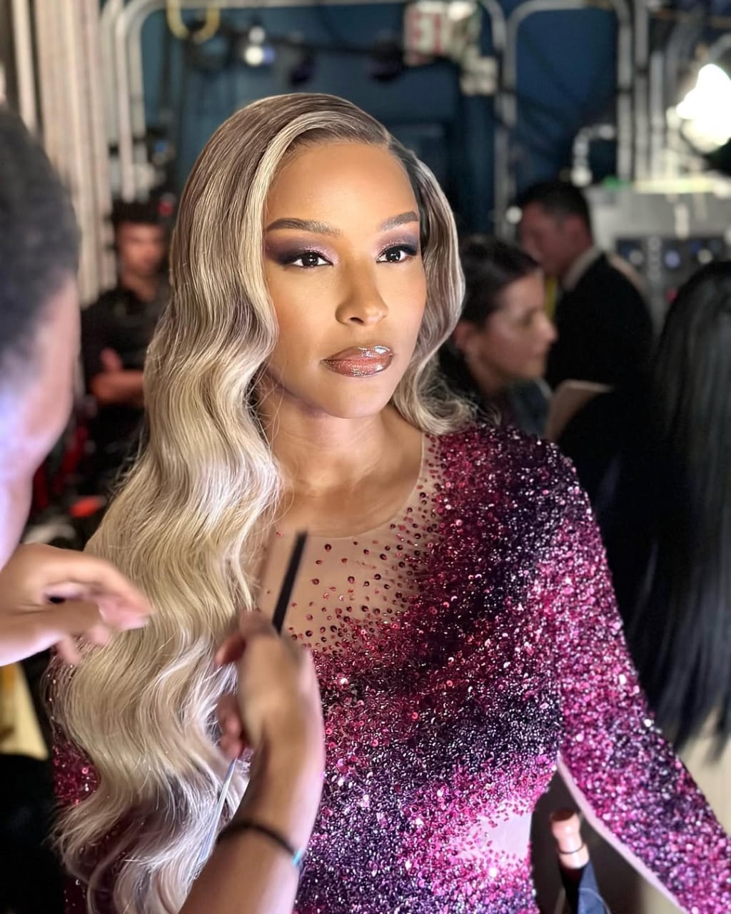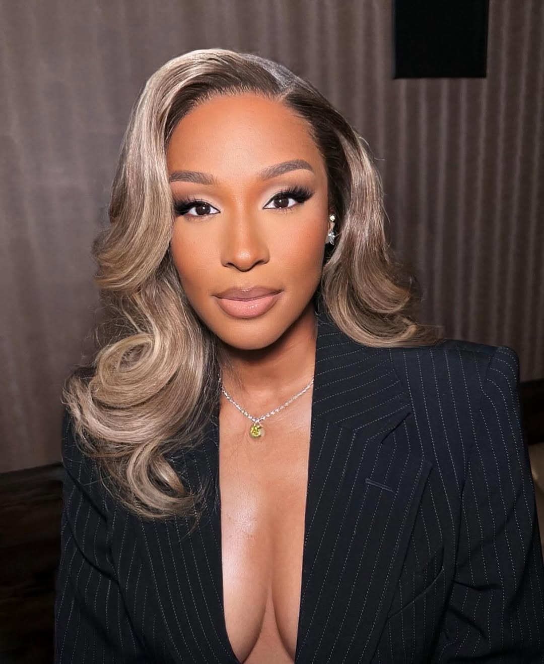 This is blonde done with full drama and total elegance. The updo features sculpted loops and folds that reveal multiple blonde tones—from warm caramel to soft ash highlights. A sleek side swoop melts into delicate swirl detailing along the hairline, creating a couture finish. Despite its structure, the shade still looks natural against her skin. Paired with glossy makeup and gold jewelry, this look is pure statement glamour.